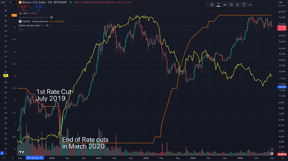 The second important event is the global shift toward quantitative easing (QE), which has already begun in several countries. In the U.S., the Federal Reserve is expected to cut rates on September 18, 2024, marking a pivot from over two years of quantitative tightening to an approach focused on stimulating economic growth. Central banks worldwide are expected to engage in QE by purchasing long-term securities, increasing the money supply, lowering interest rates, and spurring economic activity. This influx of liquidity generally drives asset prices higher, with Bitcoin poised to benefit as investors seek better returns in a low-interest-rate environment. So, when you see the yellow line in the graph below rise substantially, it’s often a signal that riskier assets, like Bitcoin, are about to gain momentum.
